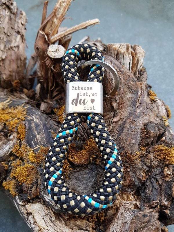 Schlüsselanhänger in Achterform, Zwischenstück aus Zinkdruckguss silberfarben „Zuhause ist, wo DU bist“