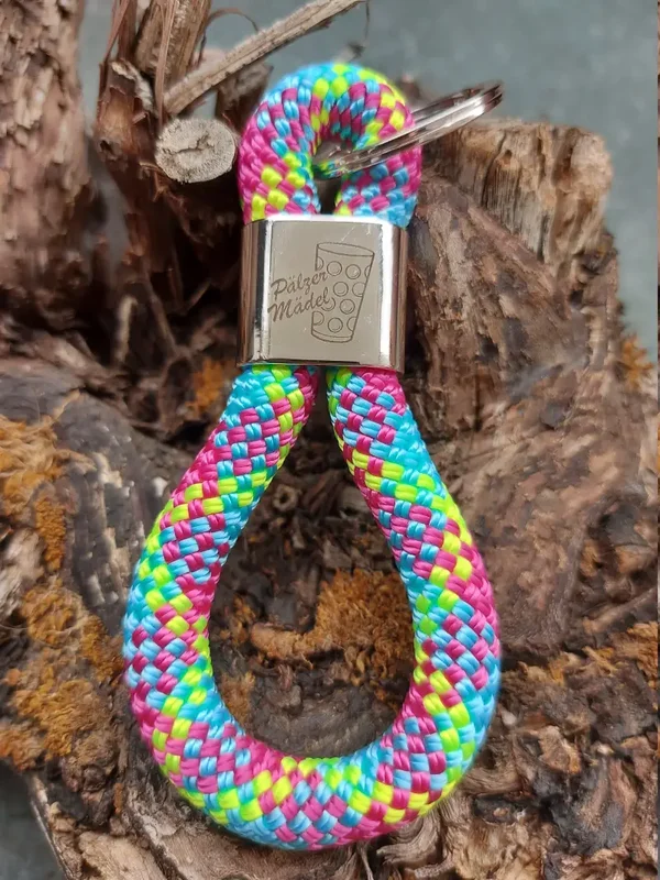 Schlüsselanhänger in Achterform, Zwischenstück aus Zinkdruckguss silberfarben „Pälzer Mädel mit Dubbeglas“