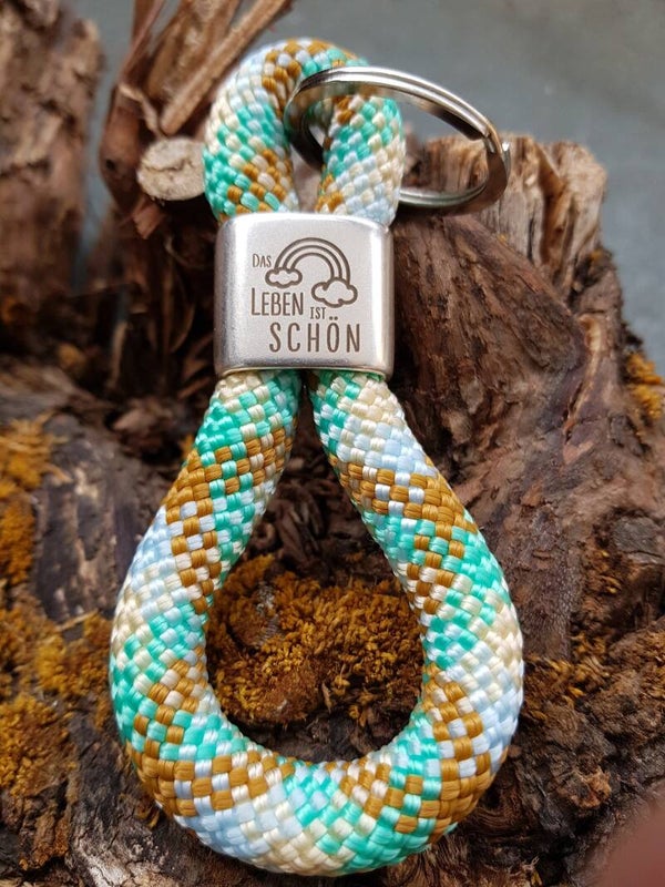 Schlüsselanhänger in Achterform, Zwischenstück aus Zinkdruckguss silberfarben „Das Leben ist schön“ Regenbogen