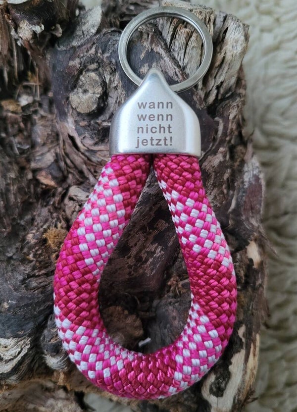 Schlüsselanhänger in Tropfenform, Endkappe aus Zinkdruckguss silberfarben „wann wenn nicht jetzt!“