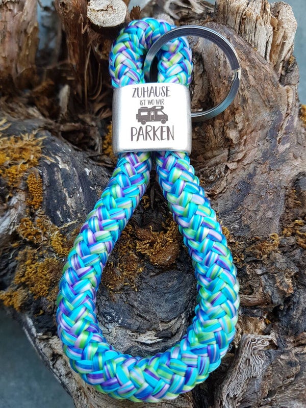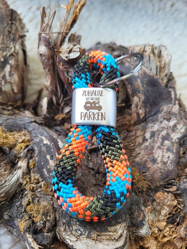 Schlüsselanhänger in Achterform, Zwischenstück aus Zinkdruckguss silberfarben „Zuhause ist, wo wir parken“ Wohnmobil