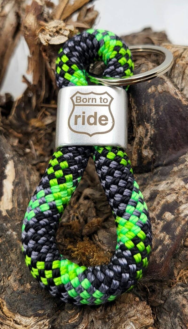 Schlüsselanhänger in Achterform, Zwischenstück aus Zinkdruckguss silberfarben „Born to Ride“