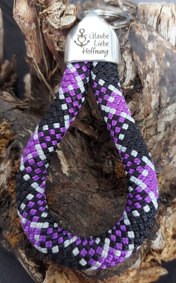 Schlüsselanhänger in Tropfenform, Endkappe aus Zinkdruckguss silberfarben „Glaube Liebe Hoffnung“