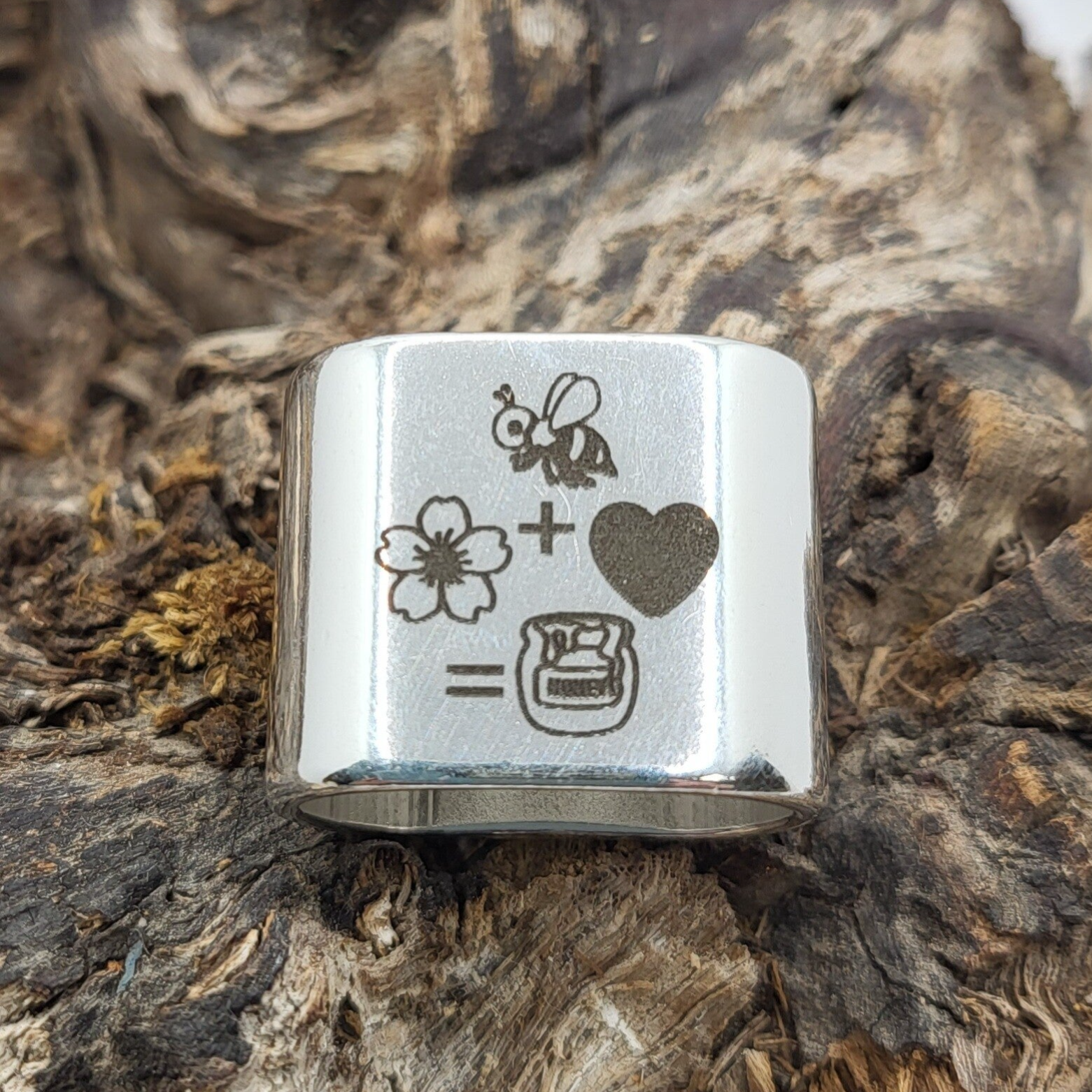 Schlüsselanhänger in Achterform, Zwischenstück aus Zinkdruckguss silberfarben „Biene-Blume-Herz-Honigtopf“